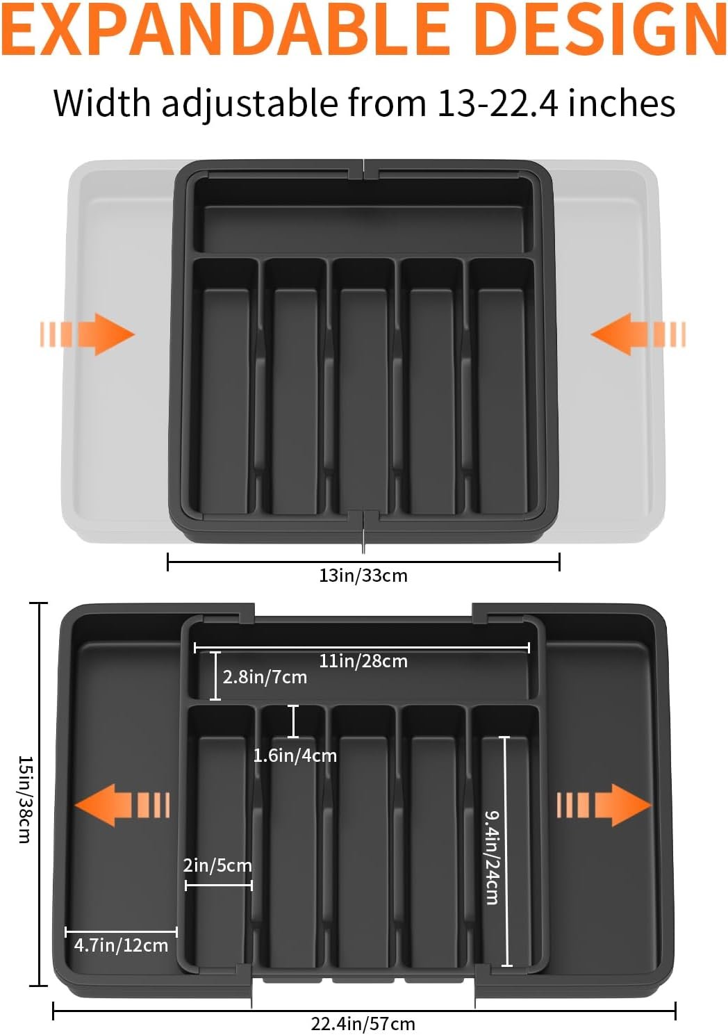 Please measure your drawer to ensure proper fit. Our organizer measures 39cm in length, 4.6cm in height, and can expand from 33cm to 60cm in width, which fits various drawer sizes effortlessly.